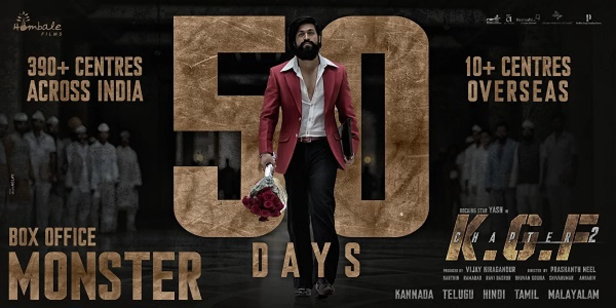 കെജിഎഫ് 2 തിയേറ്ററുകളിലെത്തി 50 ദിനങ്ങള് പിന്നിടുന്നു. നിര്മ്മാതാക്കളായ ഹൊംബാളെ ഫിലിംസ് സന്തോഷം പങ്കുവെച്ചു. ഇന്ത്യയിലൊട്ടാകെ 390ല് കൂടുതല് സെന്ററുകളിലും വിദേശരാജ്യങ്ങളില് പത്തിലധികം സെന്ററുകളിലുമാണ് 'കെജിഎഫ് 2' 50 ദിനങ്ങള് പൂര്ത്തിയാക്കിയത്.