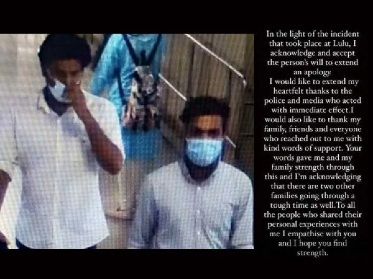 അതേസമയം തന്നെ അപമാനിയ്ക്കാൻ ശ്രമിച്ച യുവാക്കളുടെ മാപ്പപേക്ഷ സ്വീകരിയ്ക്കുന്നു എന്നും, ഇരുവരുടെയും കൂടുംബാംഗങ്ങളെ ഓർത്ത് മാപ്പ് നൽകുന്നു എന്നും നടി ഇൻസ്റ്റഗ്രാമിൽ കുറിച്ചു. 'മാളിൽ നടന്ന സംഭവത്തിൽ യുവാക്കളുടെ മാപ്പപേക്ഷ ഞാൻ സ്വീകരിയ്ക്കുന്നു. കൃത്യ സമയത്ത് പ്രതികരിച്ച പൊലീസിനൊടും മാധ്യമങ്ങളോടുമുള്ള എന്റെ നന്ദി ഞാൻ അറിയിയ്ക്കുകയാണ്. ഇത്തരം ഒരു ഘട്ടത്തിൽ എനിയ്ക്കൊപ്പം നിന്ന കുടുംബത്തോടും സുഹൃത്തുക്കളോടും നന്ദി പറയേണ്ടതുണ്ട്. രണ്ട് കുടുംബങ്ങൾ കൂടി ഇപ്പോൾ മോശം സമയത്തിലൂടെ കടന്നുപോവുകയാണ് എന്ന് ഞാൻ മനസ്സിലാക്കുന്നു' നടി ഇൻസ്റ്റഗ്രാമിൽ കുറിച്ചു. നടിയെ അപമാനിയ്ക്കാൻ ശ്രമിച്ചിട്ടില്ലെന്നും നടിയോടും കുടുംബത്തോടും മാപ്പുപറയാൻ തയ്യാറാണ് എന്നും യുവാക്കൾ കഴിഞ്ഞ ദിവസം പുറത്തുവിട്ട വീഡിയോയിൽ പറഞ്ഞിരുന്നു.